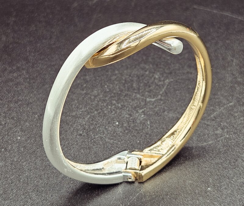 Bracciale rigido ad apertura a molla di colore argento satinato e oro lucido