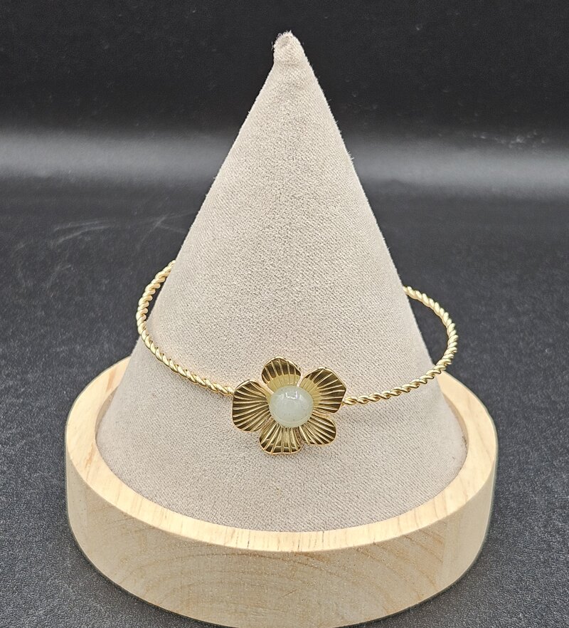Braccialetto dorato rigido con fiore e Pietrina verde chiara