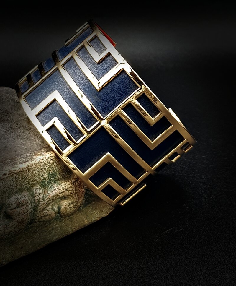 bracciale alto dorato con inserto similpelle blu scuro.  pezzo unico