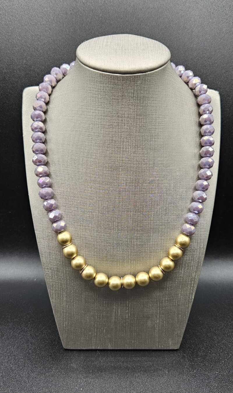 Girocollocon perle sfaccettato lilla e perle oro satinato lisce
