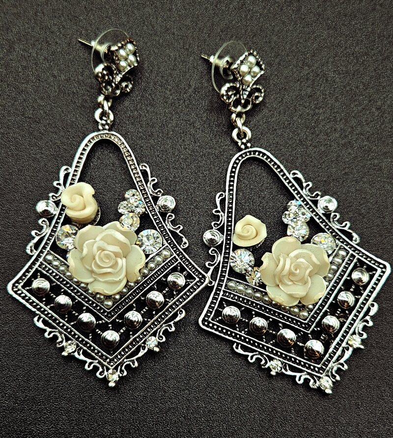 Orecchini argento anticato con strass e roselline Bianche