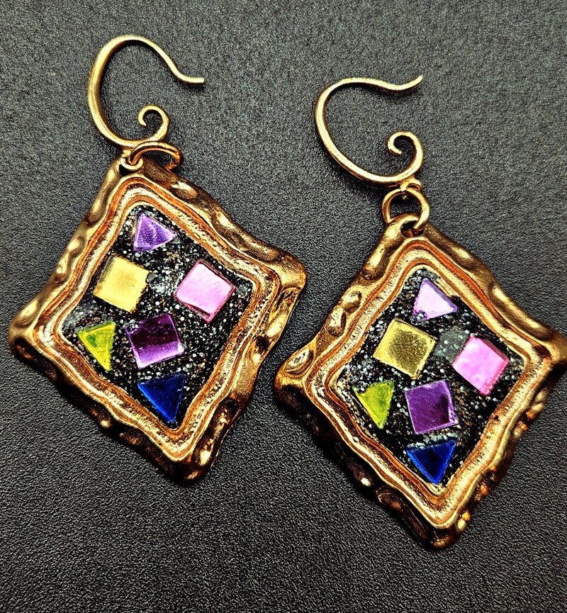 Orecchini vintage oro anticato con piccoli specchietti colorati